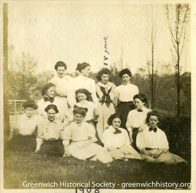 A group photograph of twelve young women in white collared shirts; five in the front, three kneeling in the middle and four standing. There is a handwritten date above one person, likely a Mead family member.Collection