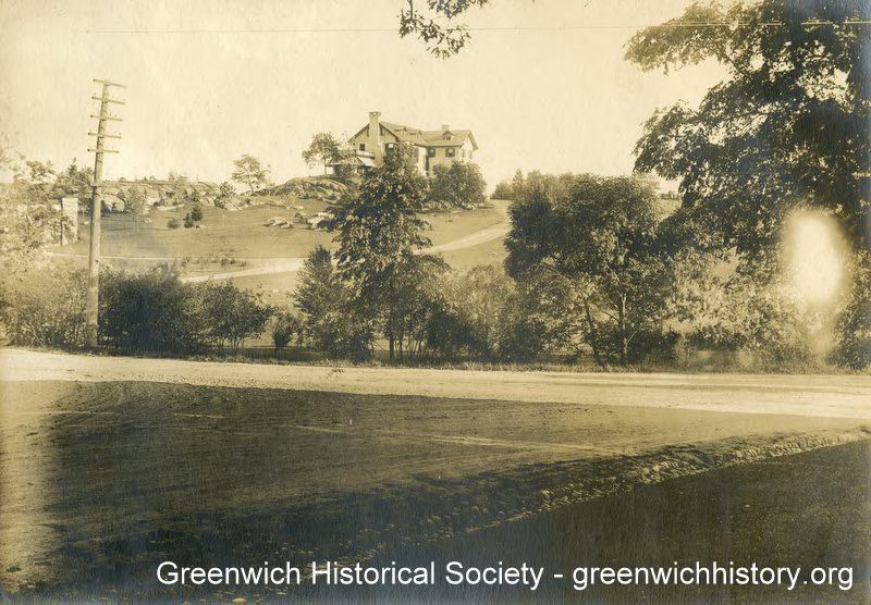 A distant, side view of the house on Glenville Road and Brookside Drive. The house has an exterior chimney, shutters, and dormers. It is built next to many rocks. In the foreground is a telephone pole and a road.Collection