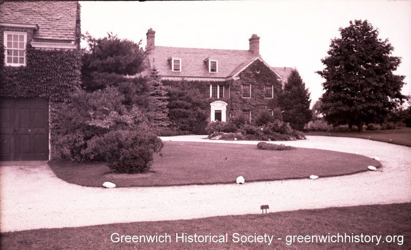 Distant view of Capenor Broad Road. Two story home with two gabled dormers and two brick chimneys. The front facade is covered by overgrown vegetation.Collection