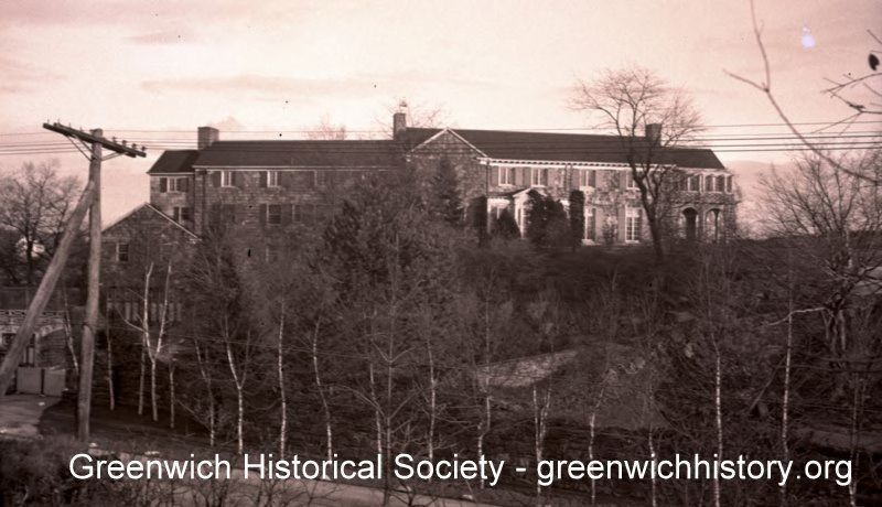 The Anchorage is a large two story home with three brick interior chimneys. The visibility of the front facade is difficult to see due to the trees and vegetation. There is a telephone pole to the left.Collection