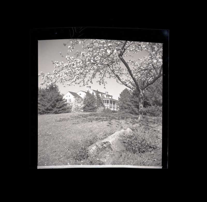 Distant view of the side of the house with flowering tree.