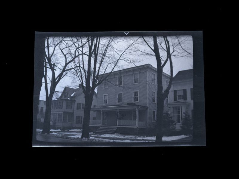 View of a three-story building with porch and neighboring buildings along the road in the snow.