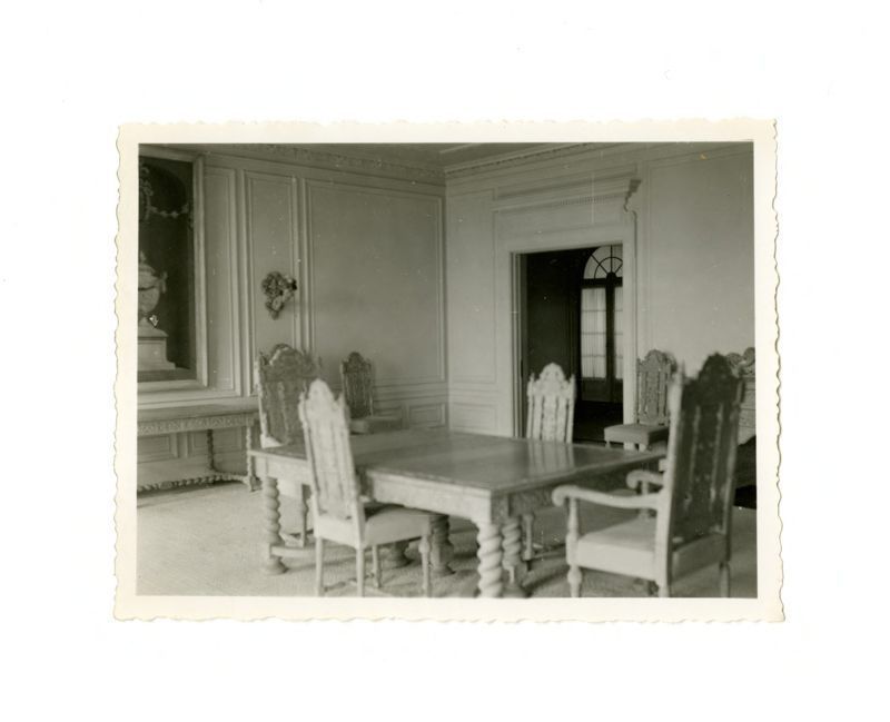 View of a dining area with a wooden table and chairs and decorative antiques.