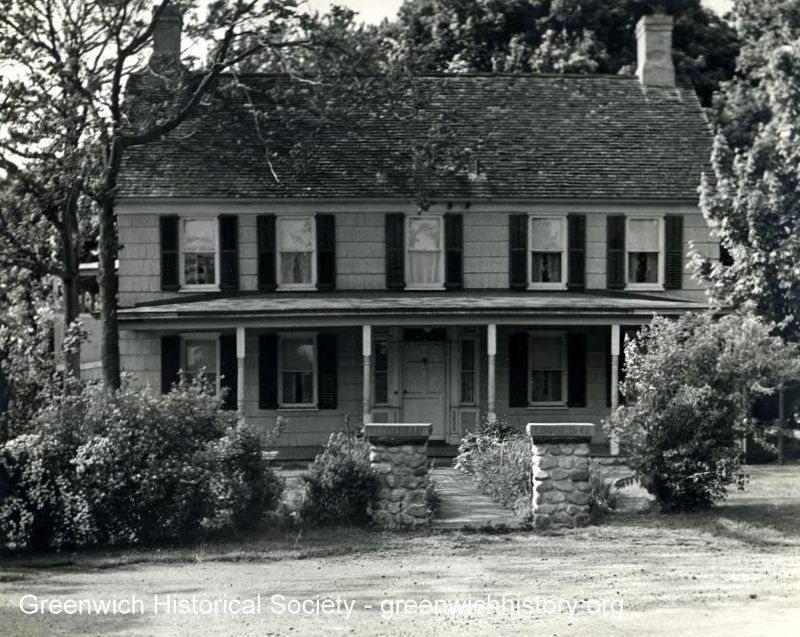 The two story, shingled home, originally built in 1795, has five ranked windows in front, two chimneys, and a full-width front porch. Two fieldstone pillars adorn the entrance to the front walkway.Collection