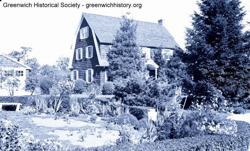 The two story shingled home has three-ranked windows in front and an attic-story window on the side. Tall conifer trees obscure the front of the house. An extensive garden is in the side yard, in front of the detached garage.Collection