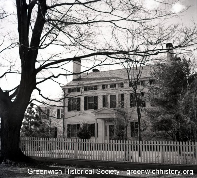 Benjamin Reynolds House, built circa 1840, located at 56 Clapboard Ridge Road. The house is also known as Hobby Horse Farm and is listed on the Greenwich Landmarks Registry. The two and a half story, clapboard home has five-ranked windows, including attic story windows; four chimneys; and a two story wing on the left side. A picket fence borders the front property.Collection