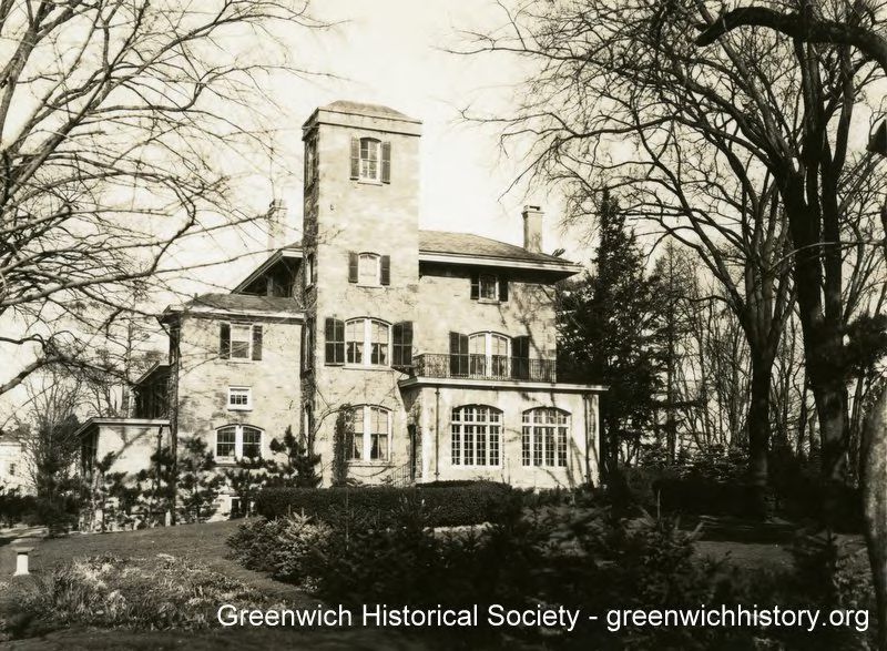 Multi-story, stone house with numerous arched windows, opposing one-story wings in front, and a four story tower on the side.Collection