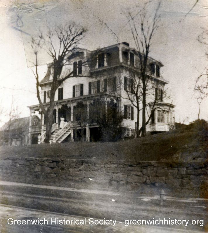 Daniel Smith Mead House on Greenwich Avenue, circa 1900. The three story structure has a full-width front porch with elaborate columns and balustrades, a large, side bay window on the first floor, and a mansard roof with dormers and a distinctive roof variation in the front. Trolley tracks and a fire hydrant are visible on the street.Collection