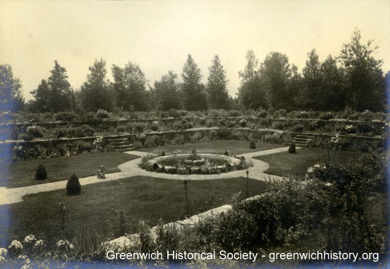 Likely Wilshire Farm formal garden with terraced borders and a roundabout design in the centerCollection