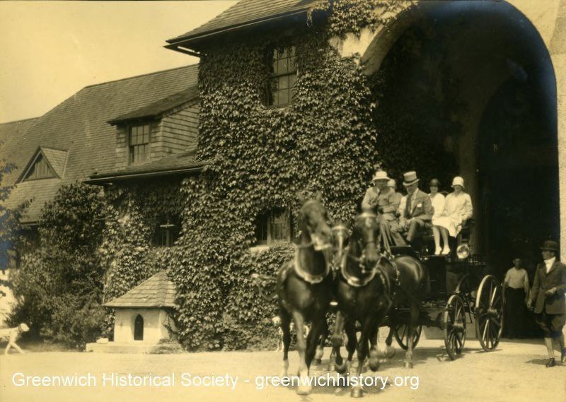 Coach and horses with five people riding, likely departing from Wilshire Farm main house. Three women and two men ride in the carriage. A person wearing riding clothes with jodhpurs stands near the carriage and another man stands inside the archway. A dog and dog house are on visible on the left.Collection