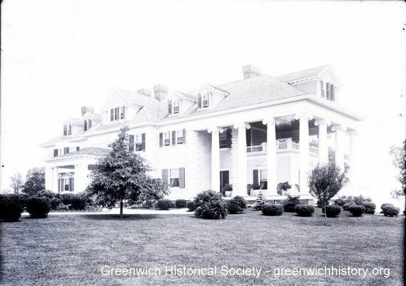 Font view of the Howard E. Spaulding mansion with garden in the foreground. The house has a distinctive two story side porch with Ionic columns surrounding a one story side wing; an extended portico over the driveway; and numerous dormers in the roof.Collection