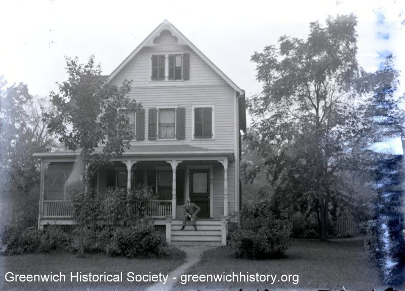Dr. Bergin seated on the front porch of his house on East Putnam Avenue in Cos Cob. The two story, clapboard home has a full-width front porch with turned spindle columns and a front-gabled roof with decorative verge boards at the peak.Collection