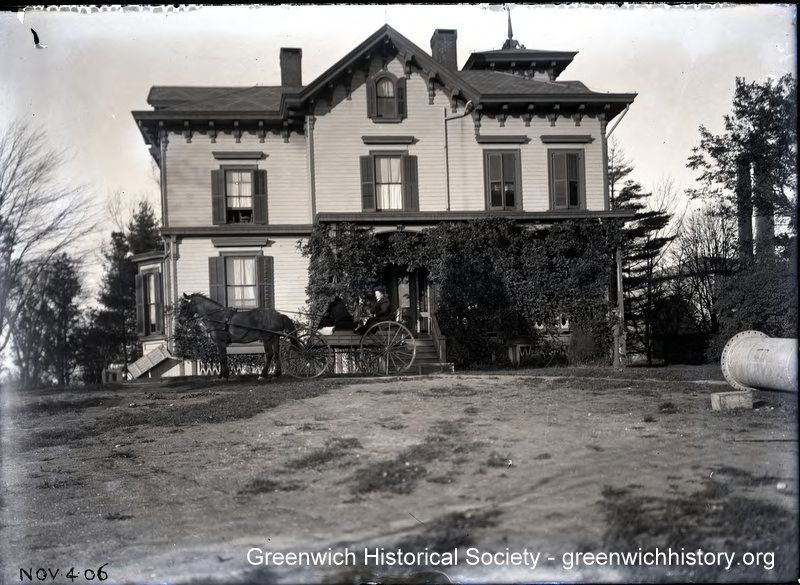 Two story, clapboard, Italianate style home with wide eave overhangs and decorative brackets at the roof line. Vines obscure the partial-width front porch. A horse and carriage with rider are in front of the house.Collection