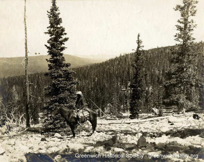 Man on horseback in unidentified forest wilderness.