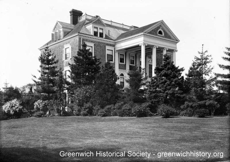 Charles T. Wills House, "Arncliff," in Belle Haven. The three story, shingled home has two brick chimneys, multiple dormers and a full-height entry porch with ionic columns and a half-round window in the front pediment. The house was built circa 1890. Evergreen trees boarder the yard.Collection