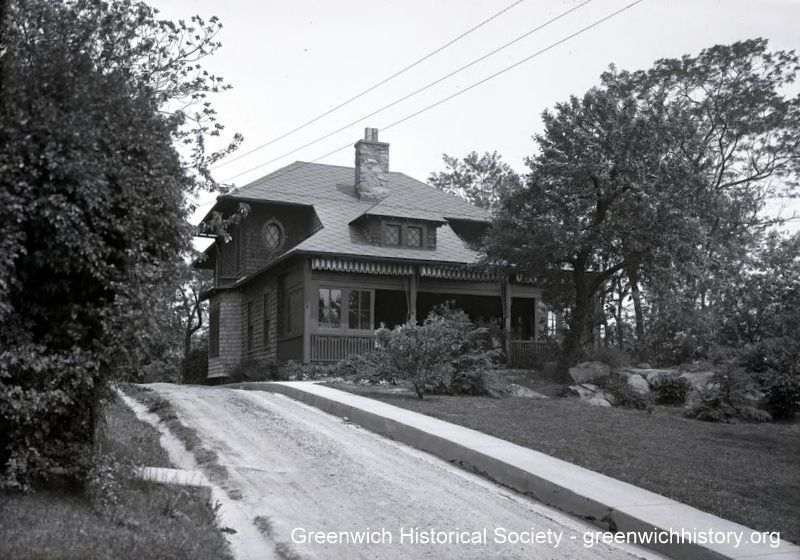 Front view of Carleton Hubbard House, circa 1920, from its driveway. The shingle-style home has a fieldstone chimney, a partially enclosed, full-width front porch, a hipped dormer in front with two windows, and an oval window in the second story.Collection