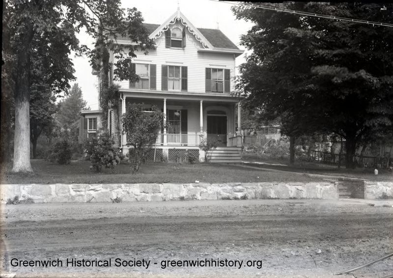 Frank Ferris House on unpaved Strickland Road, circa 1906. The two story home has a full-width front porch, a double door entrance, floor to ceiling windows on the first floor, and decorative verge boards along the central dormer.Collection