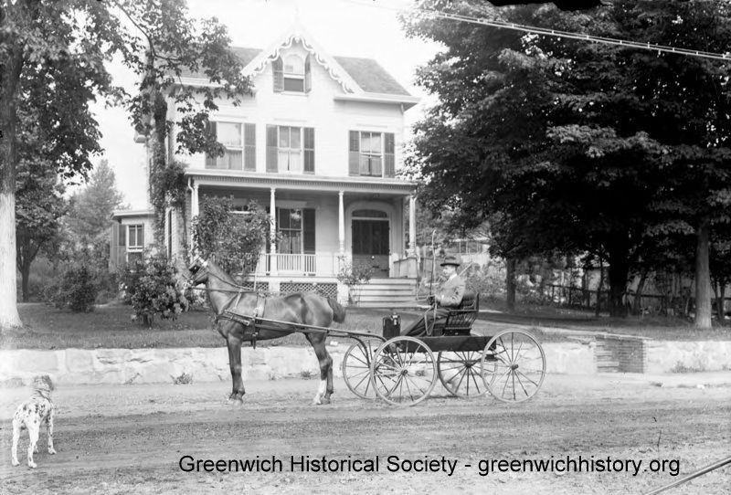 Frank Ferris in front of his house on Strickland Road, sitting in a carriage with a Dalmation dog looking onCollection