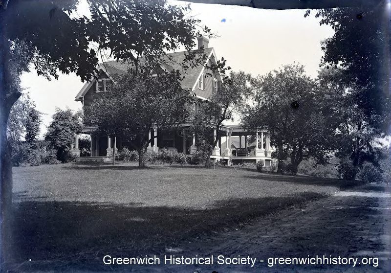 Summer home of Don Seitz on unpaved Strickland Road in Cos Cob. The large, three story, clapboard home has dormers in the roof and a large wrap around porch with a circular projection at one end.Collection