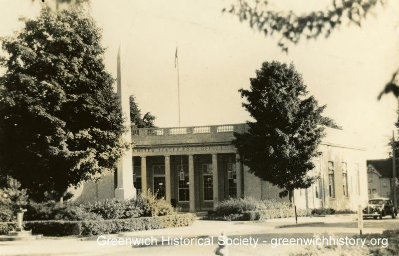 Greenwich Post Office, 310 Greenwich Avenue, with full view of World War I memorial in front and drinking fountain in lower left cornerCollection