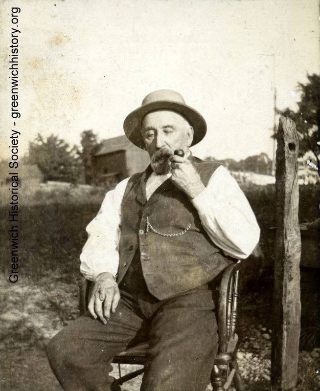 Denom Palmer of Palmer and Duff Shipyard seated in a chair outside with pipe and hatCollection