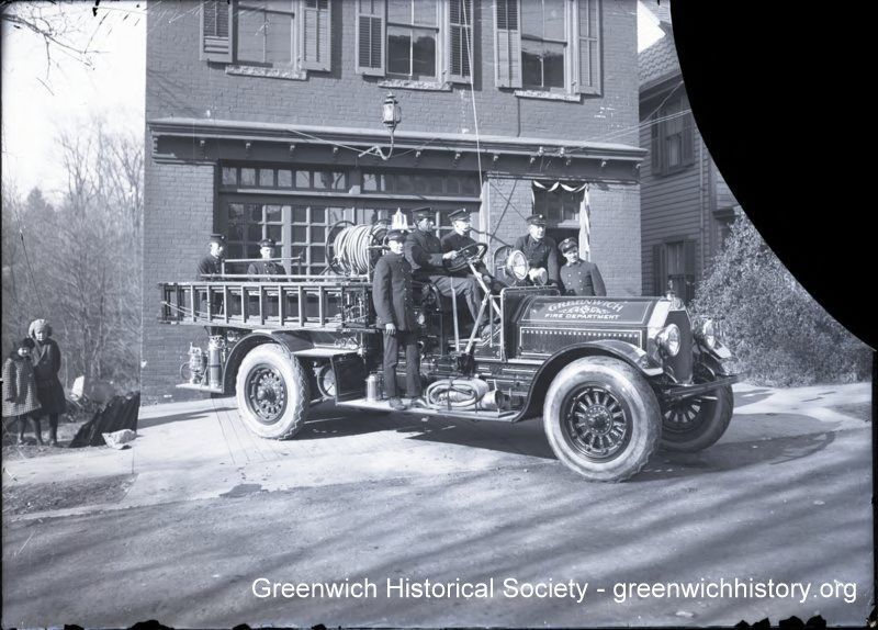 Fire fighters in uniform around a fire engine in front of the fire house on Arch Street. Two girls watch from the side.