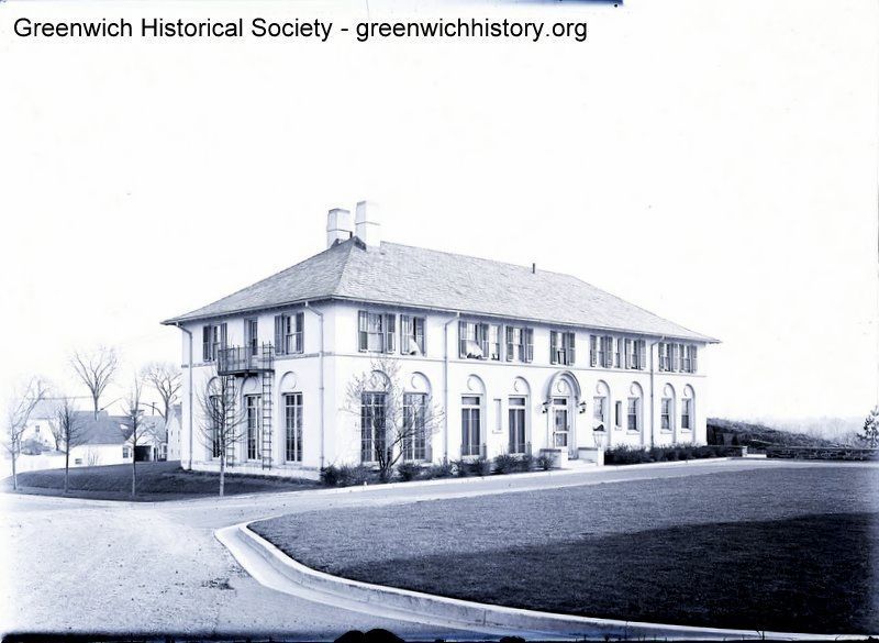 Greenwich Hospital Nurses Home, circa 1918. The two story, nine-ranked building has floor to ceiling windows on the first floor with decorative arches in the facade above them. The second story has shorter windows with shutters.Collection