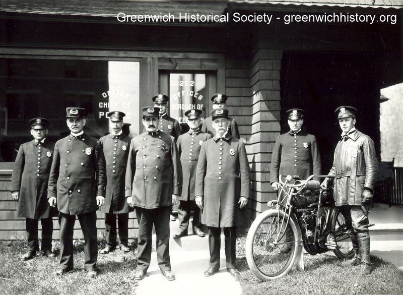 Members of the Borough of Greenwich Police Force in uniforms with badges in front of Police Headquarters, 272 Greenwich Avenue. One officer is wearing a leather coat and high boots is standing next to a motorized bicycle. Policemen and 1st motorcycle, James Fahey, first on left; Fitzroy at far right, 1st row; James Nedley is third from left.Collection