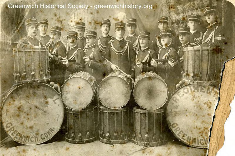 Greenwich Regimental Band in uniforms and with drums. Likely Fred Ferguson in center (eight from left)Collection