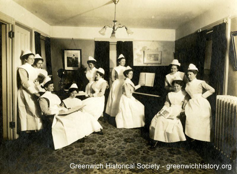 Nurses in uniform relaxing by the piano at Greenwich Hospital on Milbank AvenueCollection