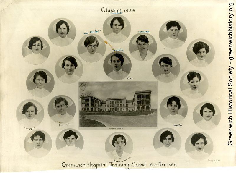 Greenwich Hospital Training School for Nurses, Class of 1929. Beulah Shrock, R.N., bottom center. Inset photograph shows Greenwich Hospital, Benedict Building, which was built in 1916.Collection