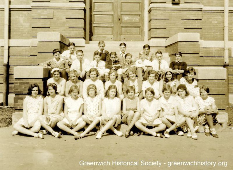 Four rows of school children seated on the front steps of Sound Beach School. There are 18 girls and 12 boys.Collection
