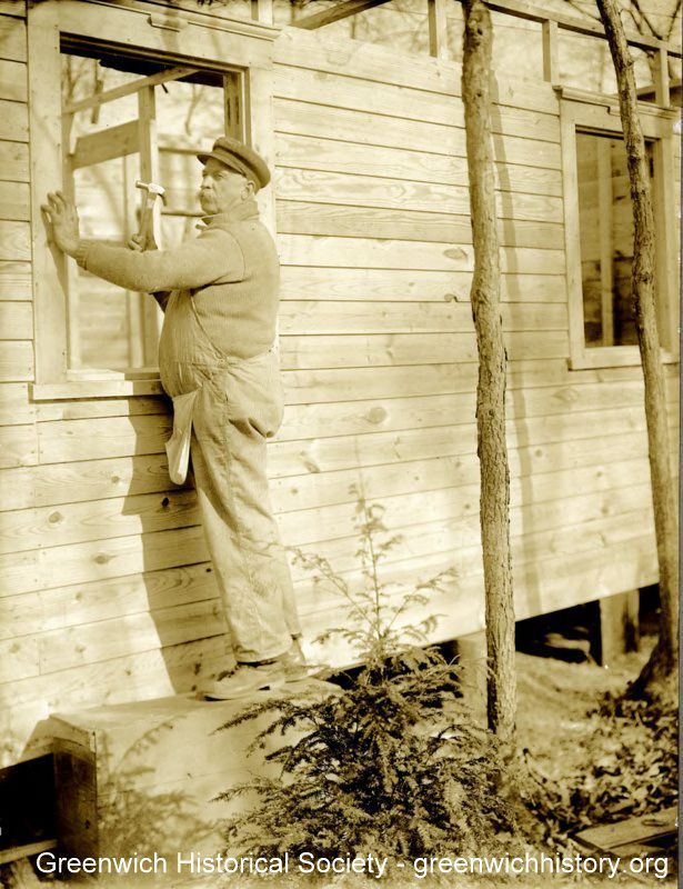 Unidentified man, possibly Stuart M. Potter, hammering on window frame of a partially constructed buildingCollection