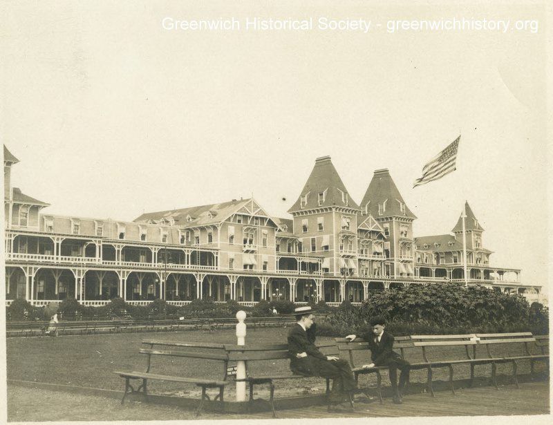 A man and boy dressed in suits, one with a straw boater hat, sitting on benches in front of an unidentified American resort.Collection