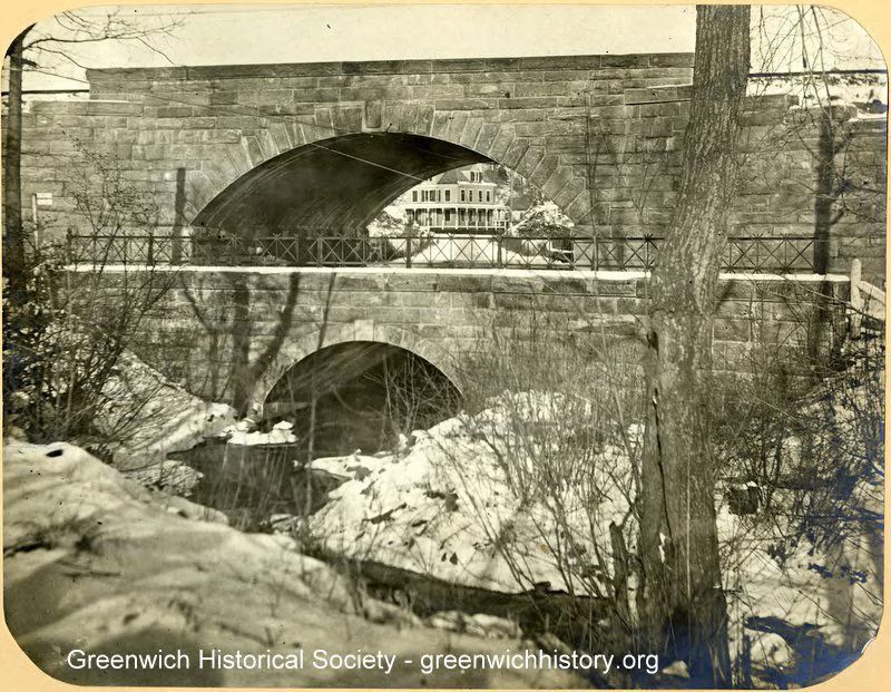 Stone bridge and culvert structures spanning Horseneck Brook in the area of Field Point Road and Prospect Street. The house in the background with the wrap a-around porch is near the intersection of Field Point Road and Horseneck Lane.Collection
