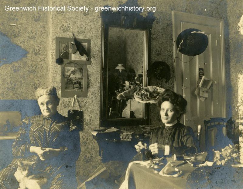 Two unidentified women seated in a cluttered room, one with a cat in her lap. (The woman with the cat could be Julia Bell). Several hats rest on stands in back of the women.Collection