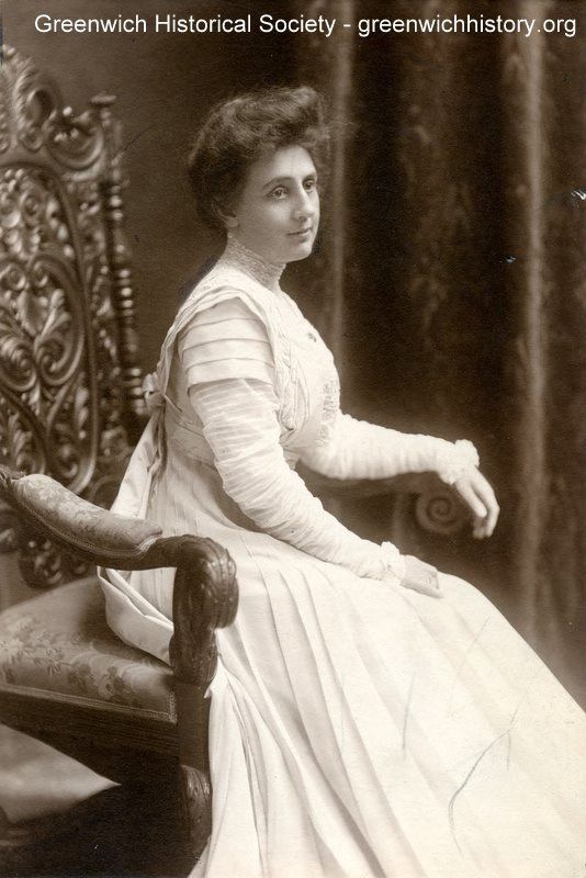 Mrs. Edward Ross in formal dress seated in large chair with curtain in the backgroundCollection