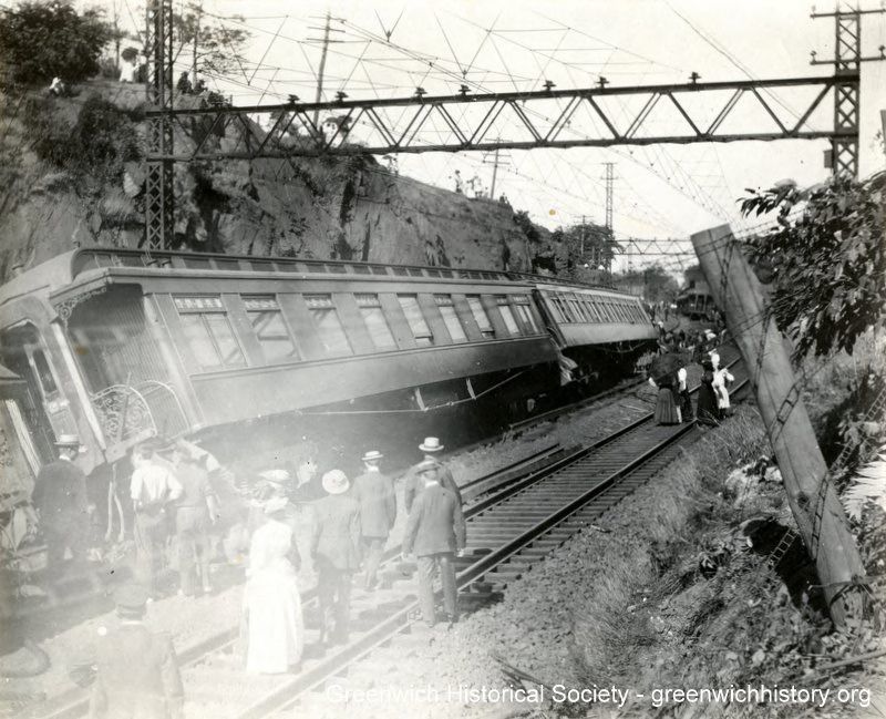 Overturned train cars underneath electrical trestle with people standing on the tracks.Collection