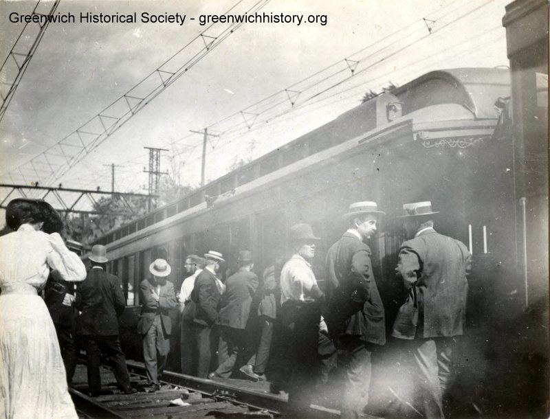 Men and one woman standing on the tracks next to a stopped railroad car. Most of the men wear suits and straw boater hats.Collection