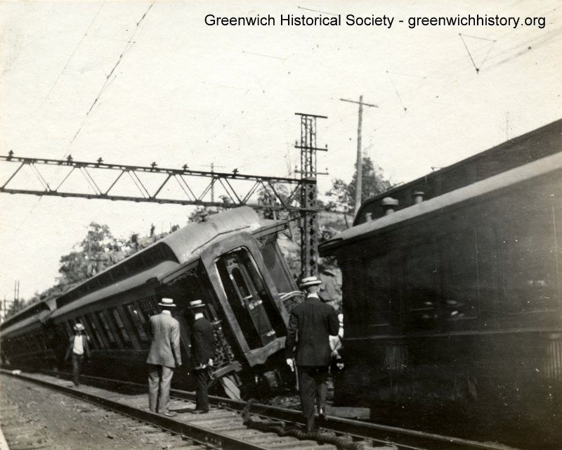 Close-up view of separated, overturned train car under electrical trestle. Four men are standing on the tracks wearing suits and straw boater hats.Collection