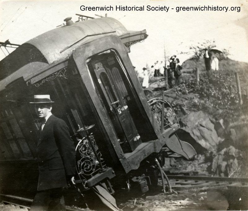 Close-up view of separated,derailed train car and onlookers. The men are wearing suits and straw boater hats and a woman in back has a large parasol.Collection