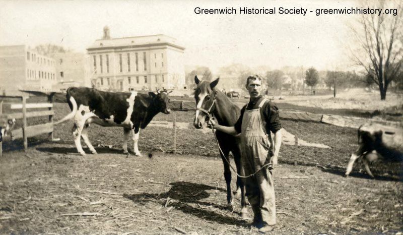 James Myles and his colt at the Daniel S. Mead Homestead. Cows stand nearby. Greenwich Town Hall is in the background.Collection
