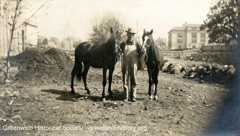 James Myles and his two colts at the Daniel S. Mead Homestead. Greenwich Town Hall is in the background on the left and Greenwich High School, at 7 Havemeyer Place, is in background on the right.Collection