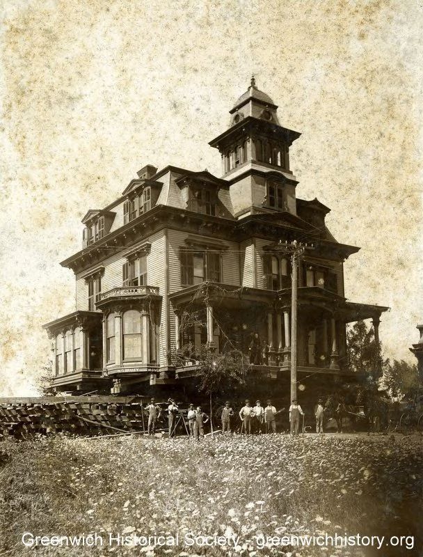 Workers with horses and wagon standing beneath a Second Empire style home which was raised on boards. The three story, clapboard home has a mansard roof with dormers,a full-width front porch, a central projecting pavilion with tower, and side bay windows.Collection