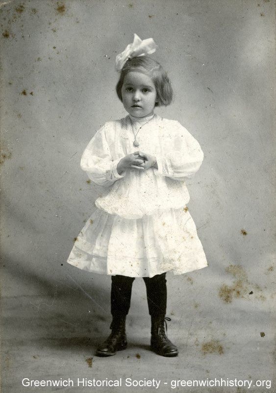 Studio portrait photograph of unidentified girl wearing white dress and locket with bow in her hair, black stockings and ankle high boots.Collection