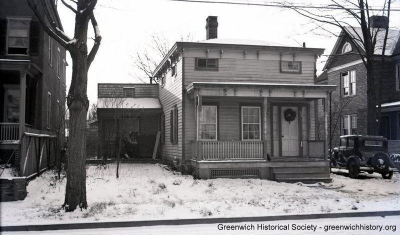 One and a half story clapboard home with full-width front porch, decorative brackets under the roof eaves and a recessed wing on the sideCollection