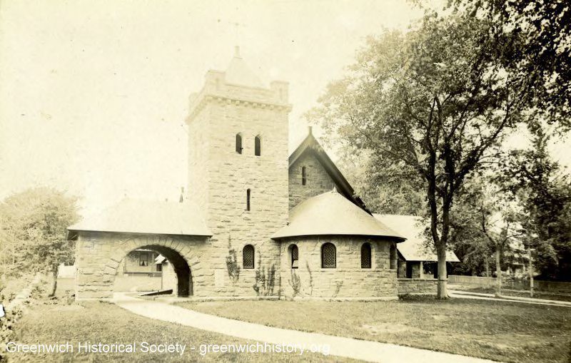 First Presbyterian Church, 18 Lafayette Place, dedicated in 1887. The medieval Romanesque architecture features rustic stone and clearly defined geometric shapes in the a square bell tower, rounded apse, triangular gables, and semi-circular arch in the prote cochere. The church's parish house is partially visible through the porte cochere arch.Collection