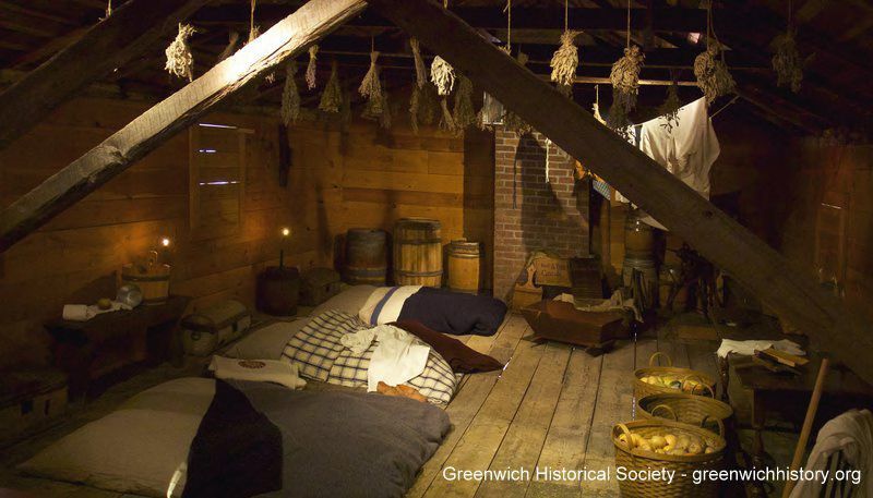 View of the attic space on the second floor of the Bush-Holley House where the enslaved people slept. Straw stuffed mattresses lay on the floor. Dried herbs hang from the rafters. Household food is stored in bins at the side of the room. A baby cradle is in the center of the room.Collection