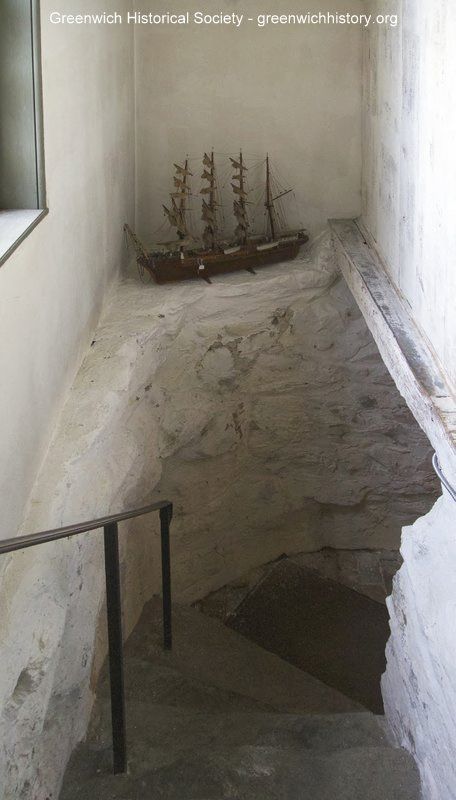 Curved basement staircase below the dining room (room 107) of the Bush-Holley house with a model sailboat on the ledgeCollection