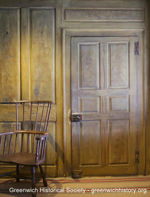 Detail of paneling and door in the north wall of Justus Luke and Sally Bush's bedroom (room 203) in the Bush-Holley House and the Windsor chair next to the door. The paneling and door were painted bird's eye maple wood grain by Justus Luke, circa 1830, over the original blue painted finish.Collection